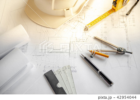 Drawing tools, helmet and blueprints on the table