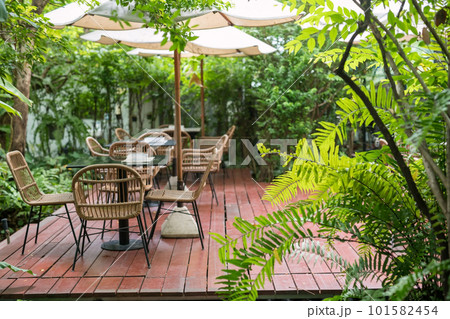 Outdoor wooden table and chairs on patio at garden in restaurant