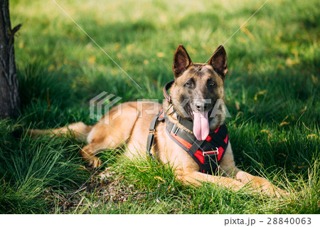 Malinois Dog Sit Outdoors In Green Grass