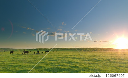 Serene Cattle Grazing at Sunrise Amidst an Expansive and Tranquil Pasture Landscape