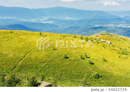 path on hillside meadow in mountain at sunset
