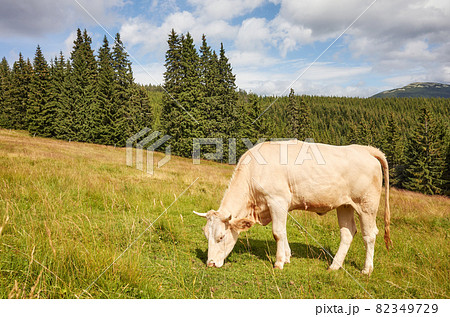 Cow grazing on a mountain pasture.
