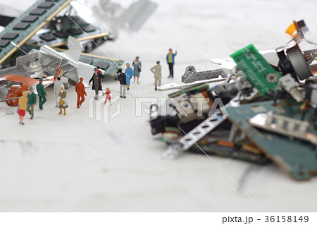 未来社会の災害とPCの残骸のジオラマ