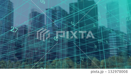 Displaying urban skyline under turquoise data grid overlay in downtown, with numeric values