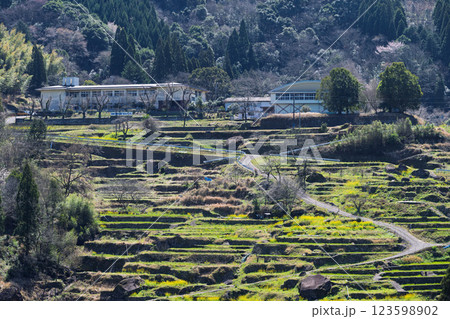 春景色の蓮華・菜の花に映える棚田風景「(日本の棚田百選) 松谷棚田(まつたにたなだ)」人吉・球磨