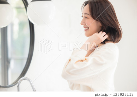 ヘアオイルやヘアミストなどのヘアケア商品を使う日本人女性(笑顔)