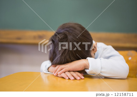 Sleepy pupil napping at desk in classroom