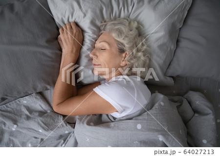 Happy mature woman sleeping on soft pillow under blanket.