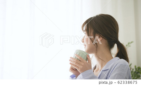 パジャマ姿でマグカップを持つ女性