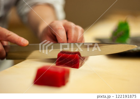 本鮪の刺身を引く板前