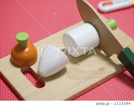 木のオモチャの野菜と包丁とまな板。料理のイメージ