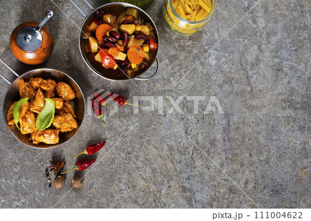 Chakalaka is a South African vegetable relish usually spicy, that is traditionally served with bread closeup on the table. Vertical