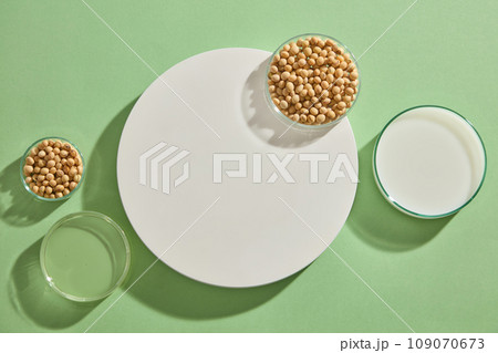 Flat lay of some glass petri dishes of soybean seeds, milk and oil displayed on green background with a round podium. Mock-up for exhibitions or presentation of cosmetic products or packaging
