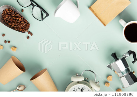 Whimsical steaming cup of coffee with sugar cubes and coffee beans on a soft pastel background