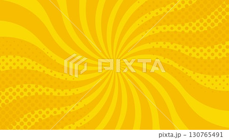 Abstract yellow spiral radial burst with dotted halftone pattern background illustration. Dynamic retro pop art vortex lines and curves creating motion effect. Decorative geometric design