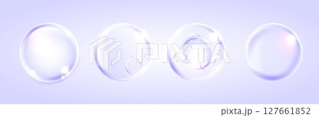 Realistic transparent soap bubbles with light reflections on a soft purple background. Perfect for skincare, cleaning, cosmetic, or freshness concepts in advertising and design.