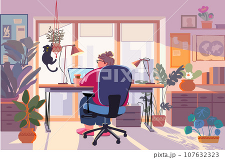 Fat woman working on a laptop while sitting at the table in a cozy interior. Adult or young programmer guy employee or student, wearing casual plus size wear. Vector flat style cartoon illustration