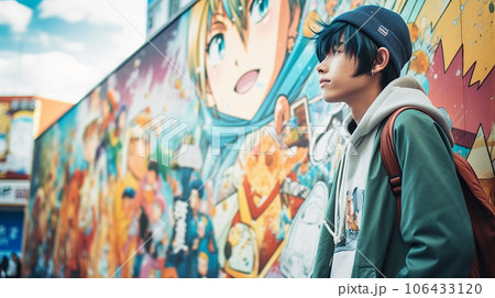 アニメキャラクターの看板の前に立つアニメ好きのオタクの男性(秋葉原・コミケ)