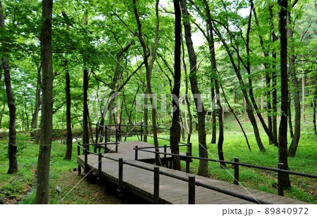 新緑が気持ち良い木漏れ日の森