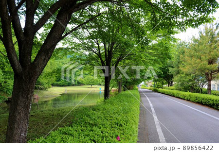 癒しの新緑の中 遊歩道 池 春のみかもやま