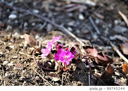 森の中でひっそりと咲くユキワリソウ みかもやま