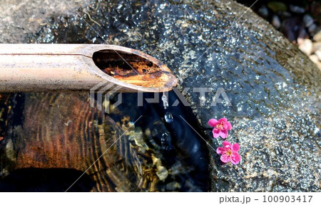 時を忘れる静かな水音 梅の花散るつくばい 早春の癒しの風景