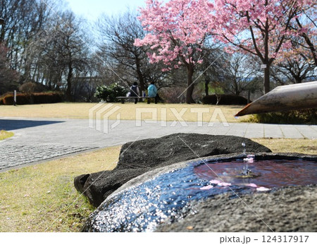 穏やかな桜咲く公園 風情あるつくばい