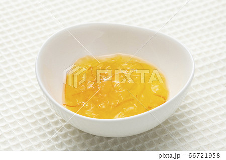 柑橘の果皮と果実を甘く煮て作ったマーマレード・ジャムが詰まったガラス瓶。