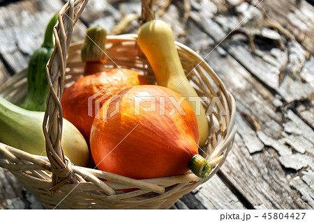 Still life with pumpkins and zucchinis in a wicker backet on the old wooden boards