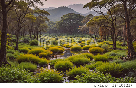 Lush green field with a small stream running through it. The scene is peaceful and serene, with the sun shining through the trees and casting a warm glow on the water. The grass is tall and green, and
