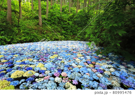一面に紫陽花を浮かべた森の中の池 みちのくあじさい園 岩手県