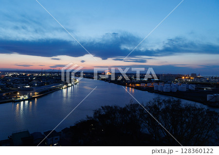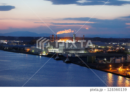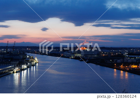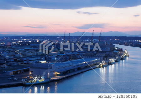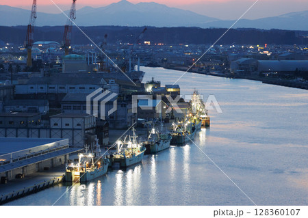 舘鼻公園グレットタワーみなとから観る夕暮れと八戸魚市場(青森県八戸市)