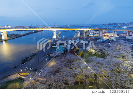 グレットタワーみなとから観る満開の桜と八戸大橋(青森県八戸市)