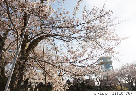 満開の桜とグレットタワーみなと(青森県八戸市)
