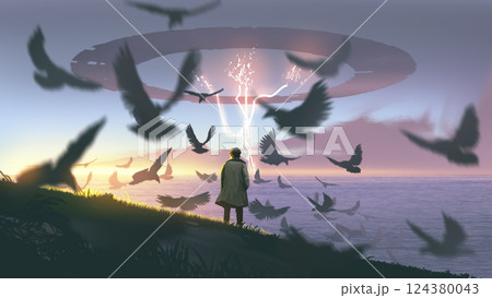 A mysterious man watches the sky shift above the ocean