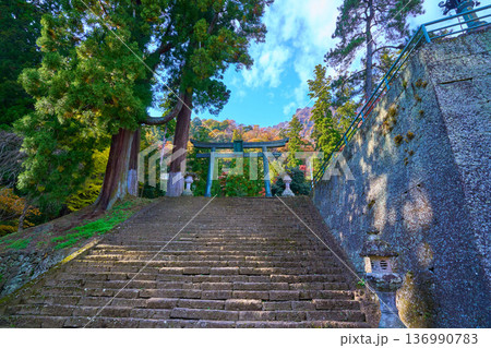 秋の群馬県富岡市の妙義神社の男坂と随神門を見る