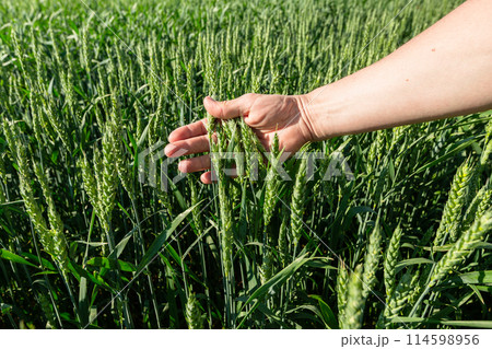 Close-up of hand touching wheat on field .