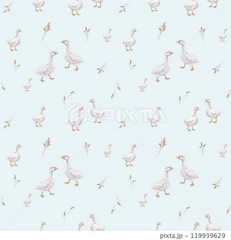 Watercolor seamless pattern with goose farm bird and ears of wheat. Tender illustration on a isolated on background. Repeat wallpapers with hand drawn illustration domestic birds and autumn harvest.