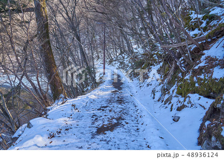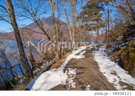 日光中禅寺湖南岸(狸窪)の残雪ある歩道の風景