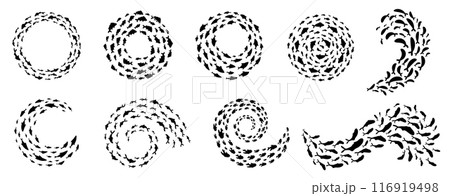 Swirling fish shoals creating dynamic spirals in the ocean. These mesmerizing underwater and marine life schools form elegant frame and border for aquatic graphic or logo design.