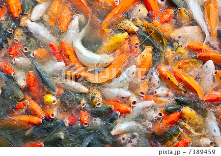 Beautiful red black white and orange colorful Koi fish in the water canal