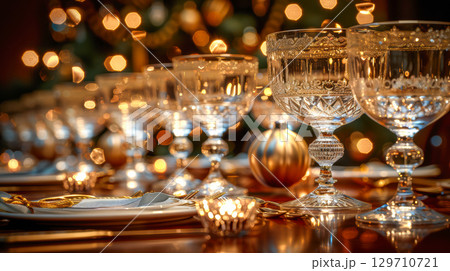 Elegant crystal glasses arranged on a festive dining table with warm bokeh lights in the background