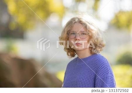 Young blonde girl wearing glasses looking at camera
