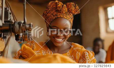 a smiling woman wearing glasses and a patterned head wrap is working with a piece of fabric