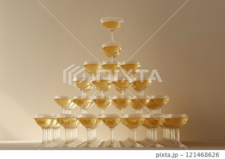 Pyramid of champagne glasses filled with sparkling wine, representing sophistication, celebration, and festivity. Wedding decorations, parties, and events where elegance and prosperity are paramount.