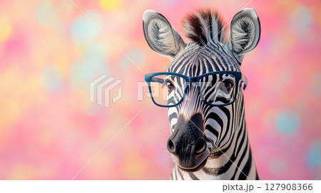 Portrait of a cheerful zebra wearing eyeglasses.