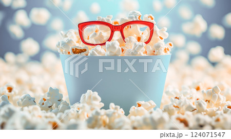 Popcorn overflowing from a bowl with quirky red glasses resting on top, set against a colorful background