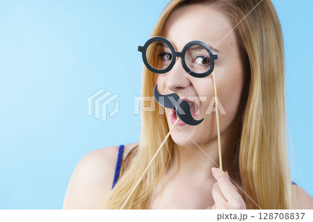 Woman playfully poses with paper mustache against blue background