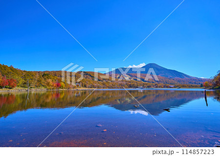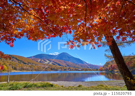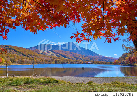 秋の長野県立科町の女神湖畔の紅葉越しに蓼科山方面を見る