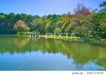 新緑の長野県立科町の女神湖北岸で新緑の水辺の風景を見る